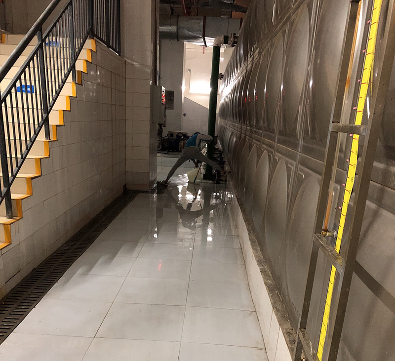 水池、万州水箱清洗内壁刷洗完毕后,清洗人员用抽泥沙的水泵将池底的污泥直接排到小区下水道。然后用清水冲洗水池,并配制二氧化氯消毒液,均匀洒在水池表面消毒,再用清水将水池冲洗干净。